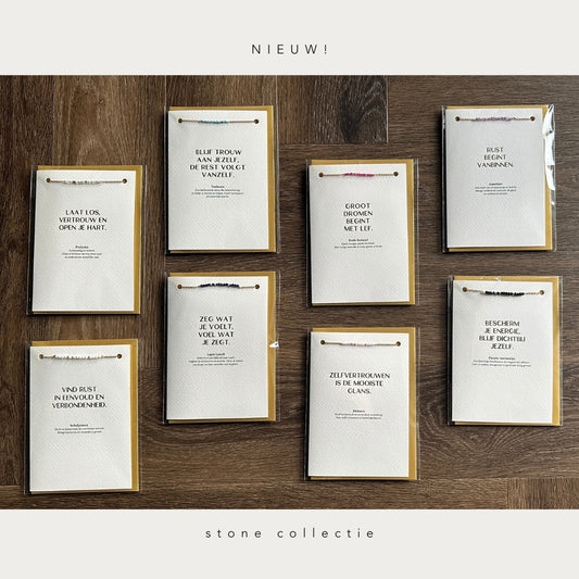 Onze collectie biedt voor elke gelegenheid een stijlvolle oplossing. Of je nu kiest voor een minimalistisch ontwerp of een speelse en kleurrijke kaart, je vindt altijd de perfecte kaart met sieraad. Elke sieradenkaart bevat een prachtig sieraad, zoals een gouden armbandje, dat de boodschap op de kaart extra speciaal maakt.