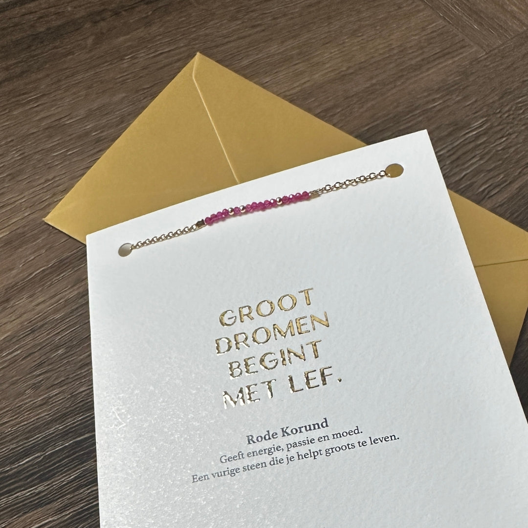 Aan de kaart is een verfijnde goudkleurige armband bevestigd met kleine Rode Korund steentjes. De Rode Korund staat bekend als een steen die energie, passie en moed geeft. Een vurige steen die je helpt groots te leven.