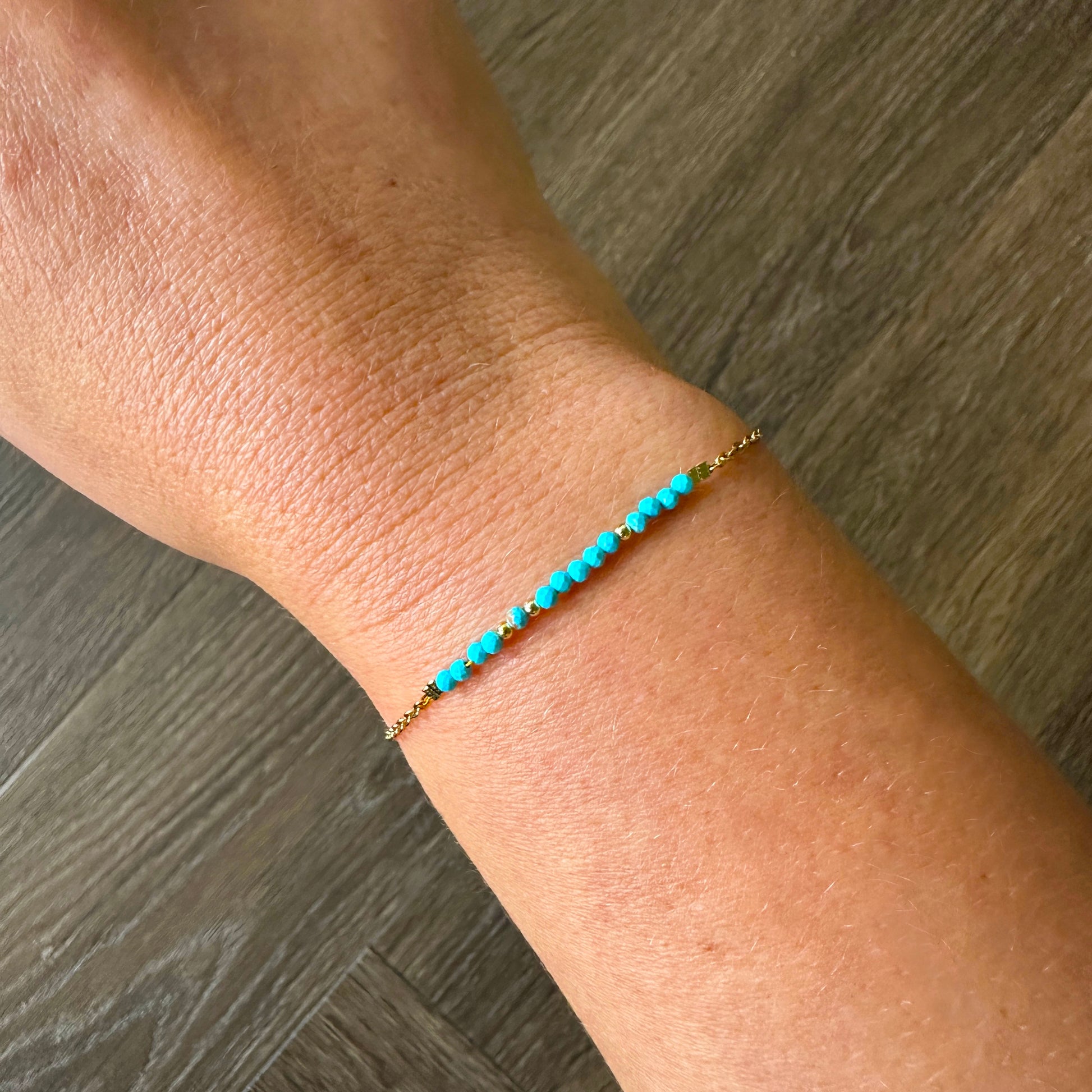 Aan de kaart is een verfijnde goudkleurige armband bevestigd met kleine Turkoois steentjes. De Turkoois staat bekend als een kalmerende steen die balans brengt en helpt je intuïtie te volgen. Geeft vertrouwen en innerlijke kracht.