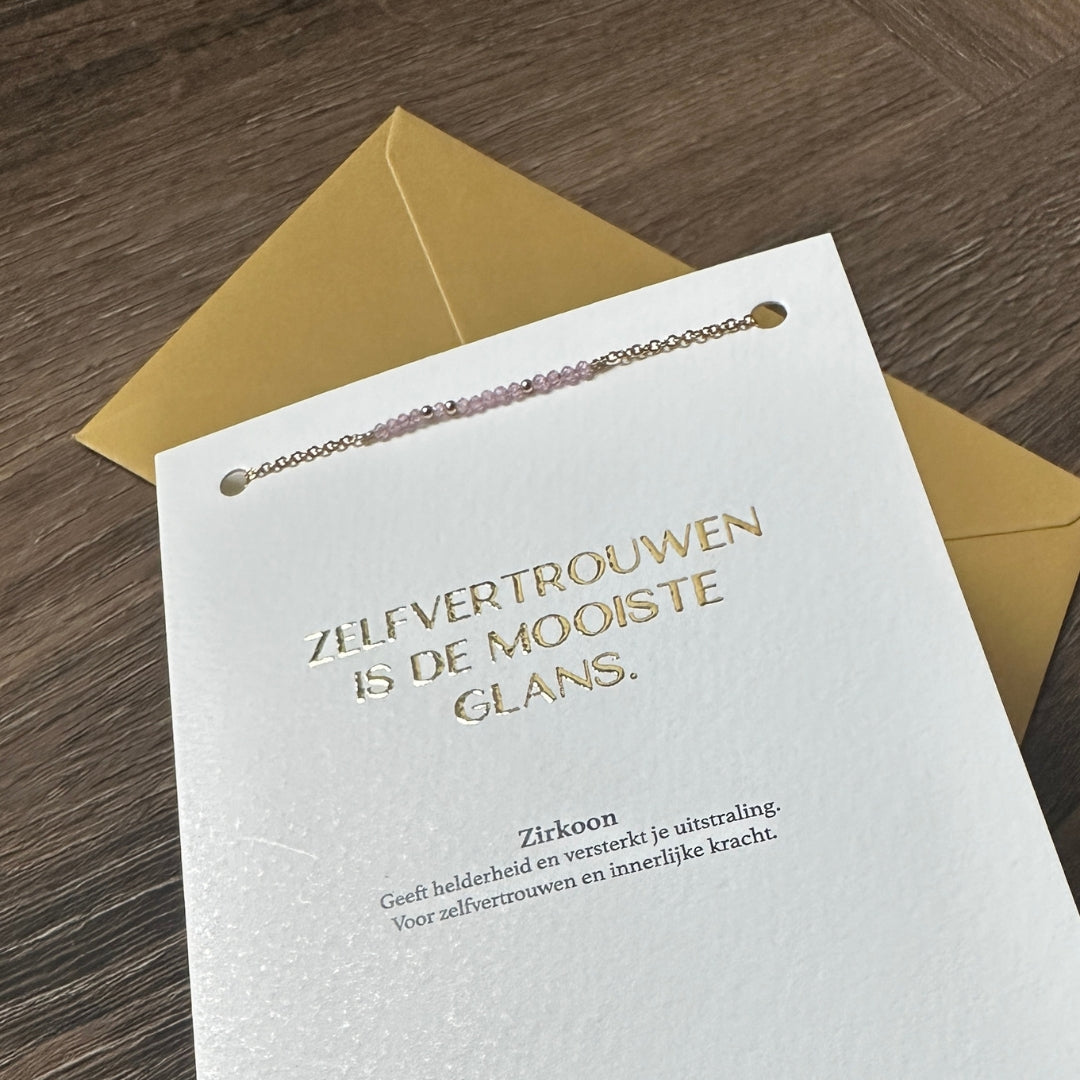 Aan de kaart is een verfijnde goudkleurige armband bevestigd met kleine Zirkoon steentjes. De Zirkoon staat bekend als een steen die helderheid geeft en versterkt je uitstraling. Voor zelfvertrouwen en innerlijke kracht.