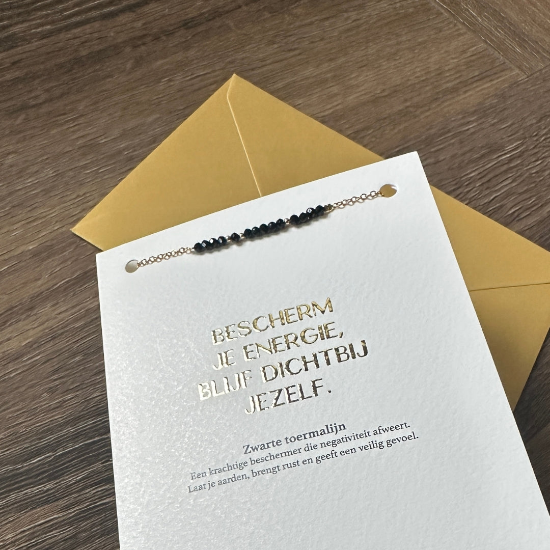 Aan de kaart is een verfijnde goudkleurige armband bevestigd met kleine Zwarte Toermalijn steentjes. De Zwarte Toermalijn staat bekend als een krachtige beschermer die negativiteit afweert. De steen helpt je te aarden, brengt rust en geeft een gevoel van veiligheid.